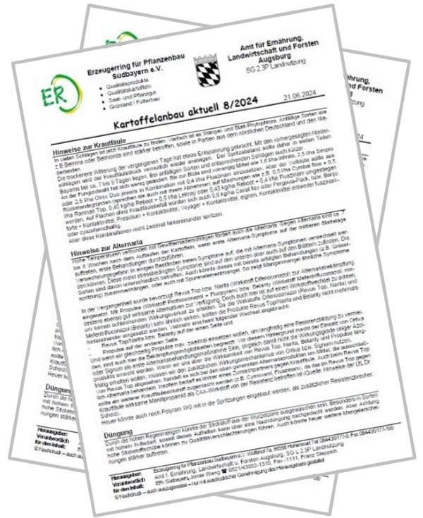 Der Erzeugerring für Pflanzenbau Südbayern e.V. bietet zusammen mit dem Amt für Ernährung, Landwirtschaft und Forsten Augsburg seit vielen Jahren ein aktuelles und umfassendes Beratungsangebot „Rund um die Kartoffel“ an. Die schriftlichen Beratungshinweise erscheinen in unregelmäßigen Abständen und abgestimmt auf die jeweilige Situation im Beratungsgebiet. Mit dem kostenpflichtigen „Kartoffelanbau Aktuell“ erhält der Teilnehmer Hinweise zu folgenden Themenschwerpunkten: